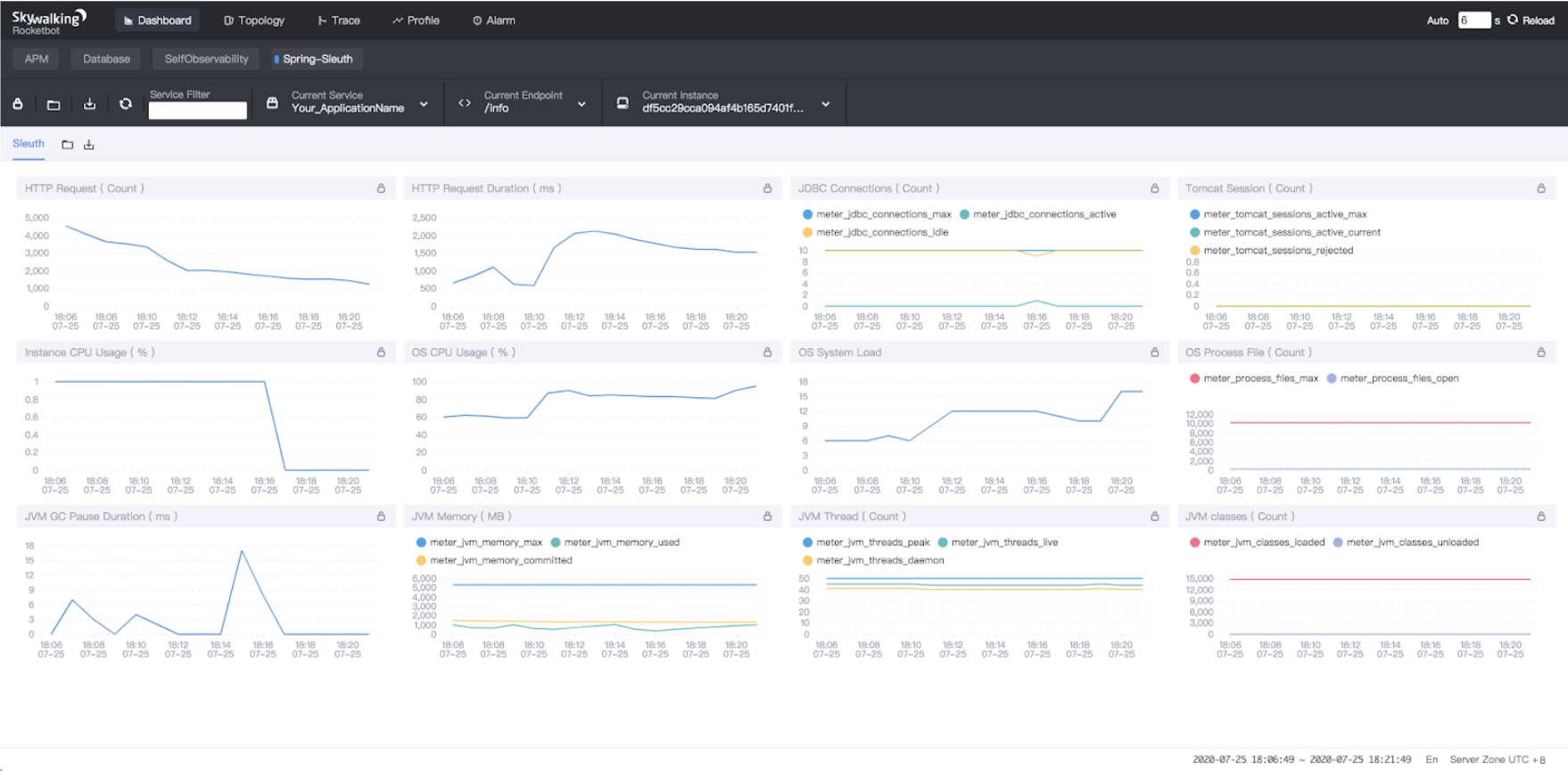 In the Java field, the Spring ecosystem is one of the most widely used. Micrometer, the metrics API lib included in the Spring Boot 2.0, is now adopted by SkyWalking’s native meter system APIs and agent. For applications using Micrometer with the SkyWalking agent installed, all Micrometer collected metrics could then be shipped into SkyWalking OAP. With some configurations in the OAP and UI, all metrics are analyzed and visualized in the SkyWalking UI, with all other metrics detected by SkyWalking agents automatically.