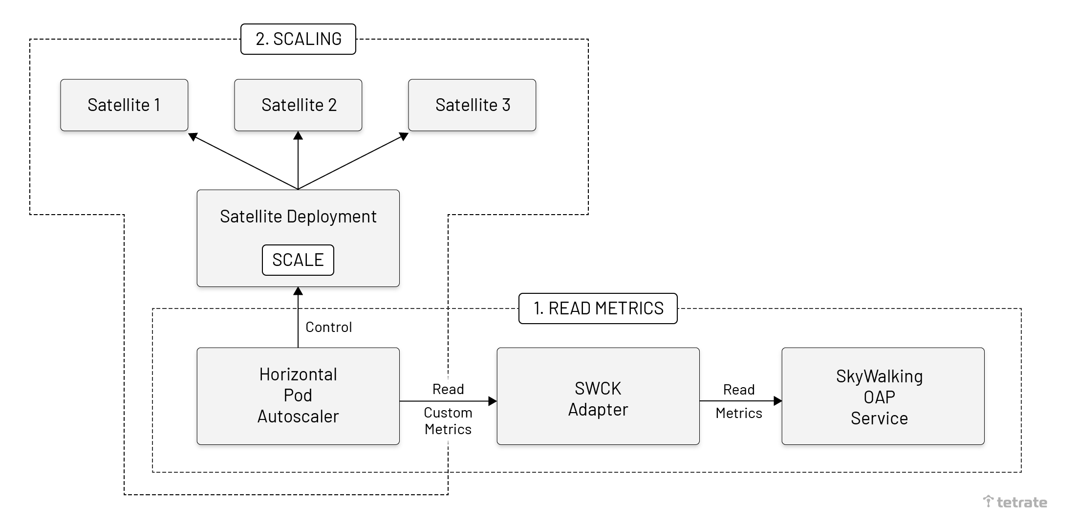 When scaling Satellite, we need to deploy the SWCK adapter and configure the HPA in Kubernetes. SWCK is a platform for the SkyWalking users, provisions, upgrades, maintains SkyWalking relevant components, and makes them work natively on Kubernetes.