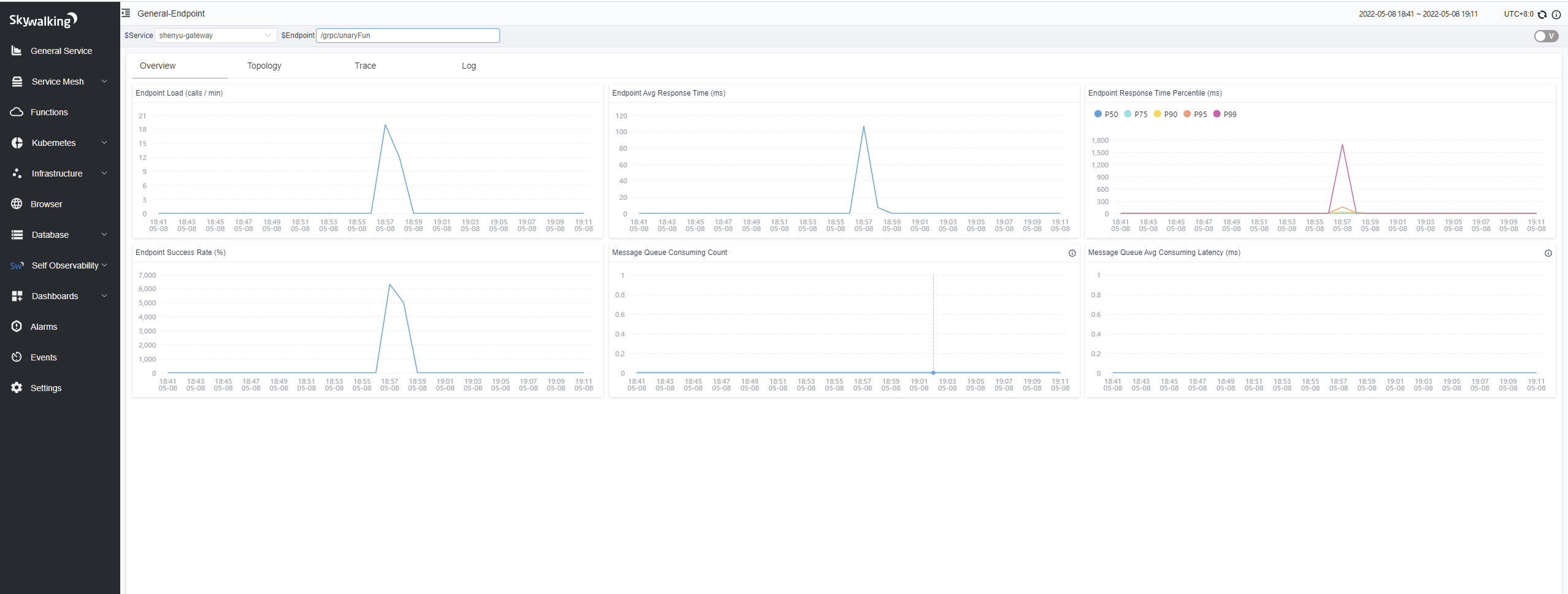Here only describe the link tracking and application performance analysis part, if you want to experience the power of SkyWalking features, please refer to the SkyWalking official documentation.