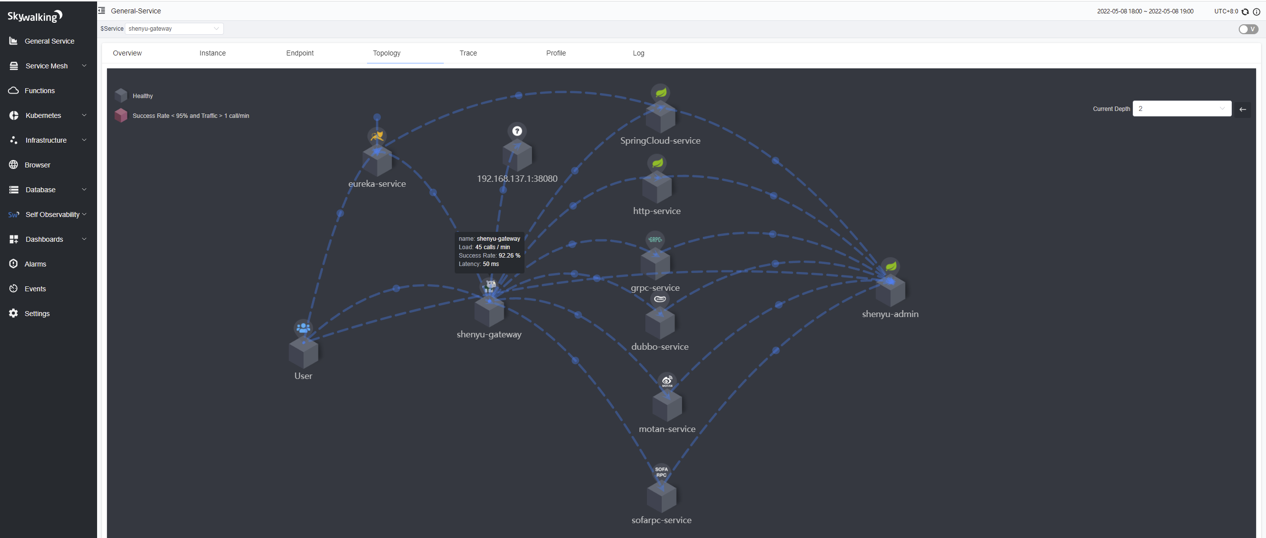 The above explains the principle of SkyWalking ShenYu plug-in implementation, the following deployment application to see the effect. SkyWalking powerful, in addition to the link tracking requires the development of plug-ins, other powerful features out of the box.