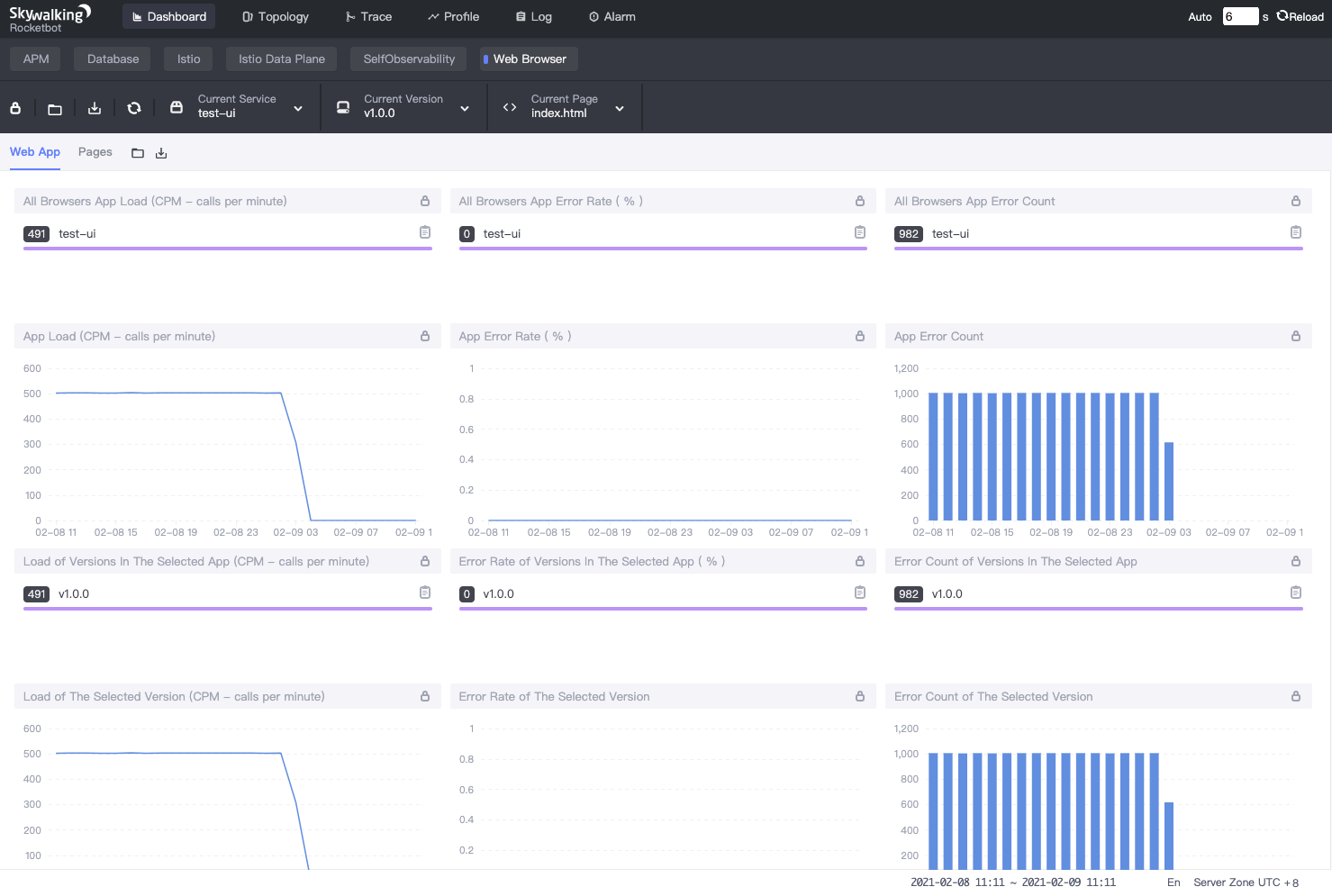 SkyWalking browser monitoring also provides metrics about how the visitors use the monitored websites, such as PV(page views), UV(unique visitors), top N PV(page views), etc.