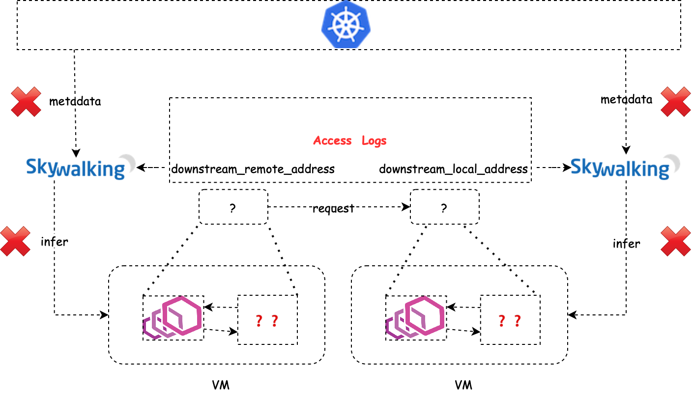 The basic idea we present in this article is to carry the metadata along with Envoy’s access logs, which is called metadata-exchange mechanism in Envoy. When Istio pilot-agent starts an Envoy proxy as a sidecar of a service, it collects the metadata of that service from the Kubernetes platform, or a file on the VM where that service is deployed, and injects the metadata into the bootstrap configuration of Envoy. Envoy will carry the metadata transparently when emitting access logs to the SkyWalking receiver.